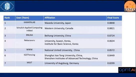 近日,IEEE ISBI 2021 Retinal Image Analysis for multi-Disease Detection(RIADD)竞赛决赛落下帷幕。经过为期两个多月紧张激烈的比拼,BV伟德官方网站代表队从上海交通大学、国立台湾大学、日本早稻田大学、日本京都大学、加拿大韦仕敦大学等全球70多支参赛队伍中脱颖而出,取得第三名的好成绩,并受邀在ISBI研讨会中对获胜算法的技术细节进行展示。