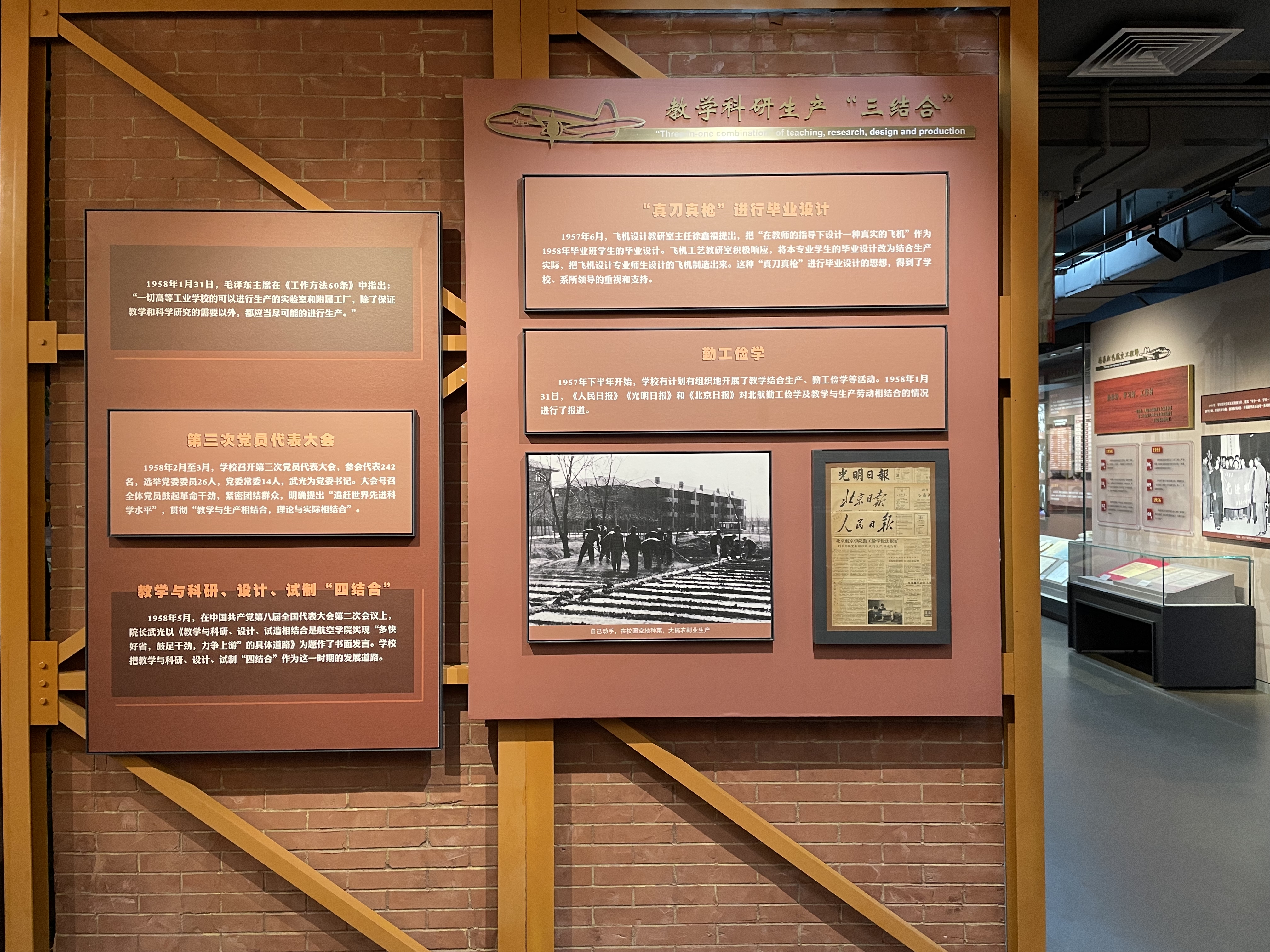 展览共分为四个部分:“创业兴学、与国同行”,回顾了从建校到1977年的历史;“抢抓机遇、改革奋进”回溯了1978-2001年的学校发展;“好中快进,科学发展”总结了2002-2011年学校事业的发展;“立德树人,逐梦一流”展现了“空天报国”精神在新时代传承弘扬。