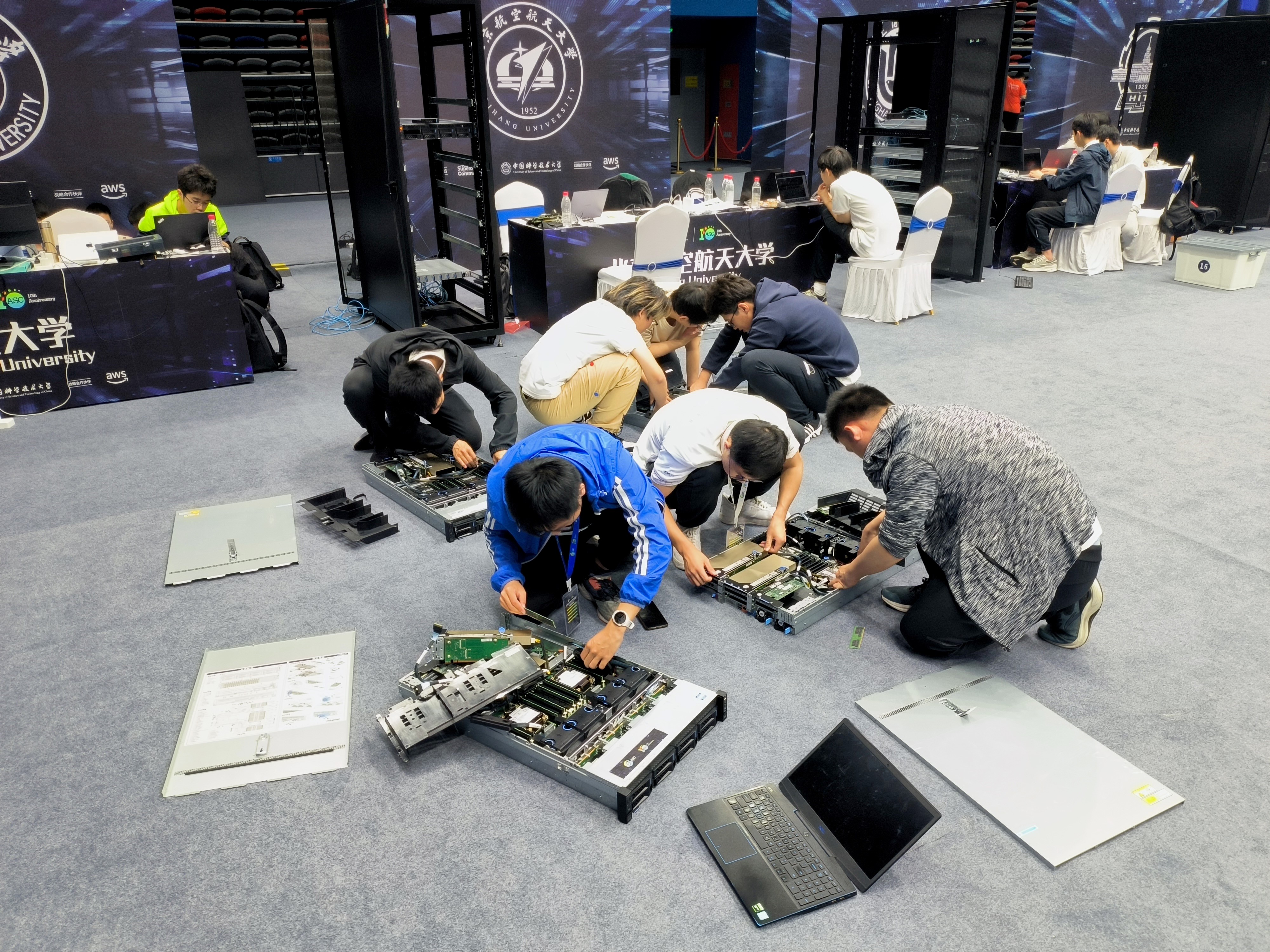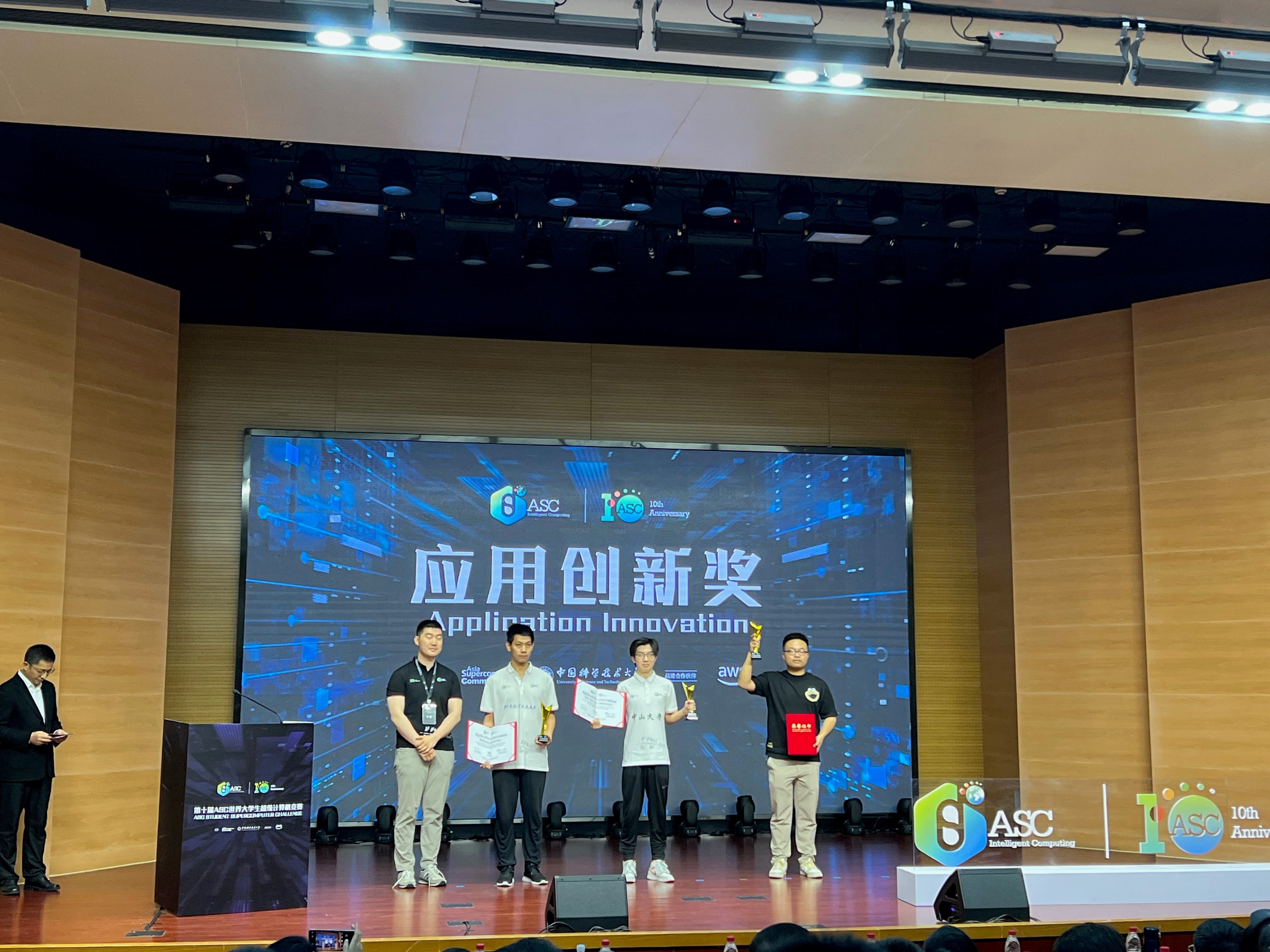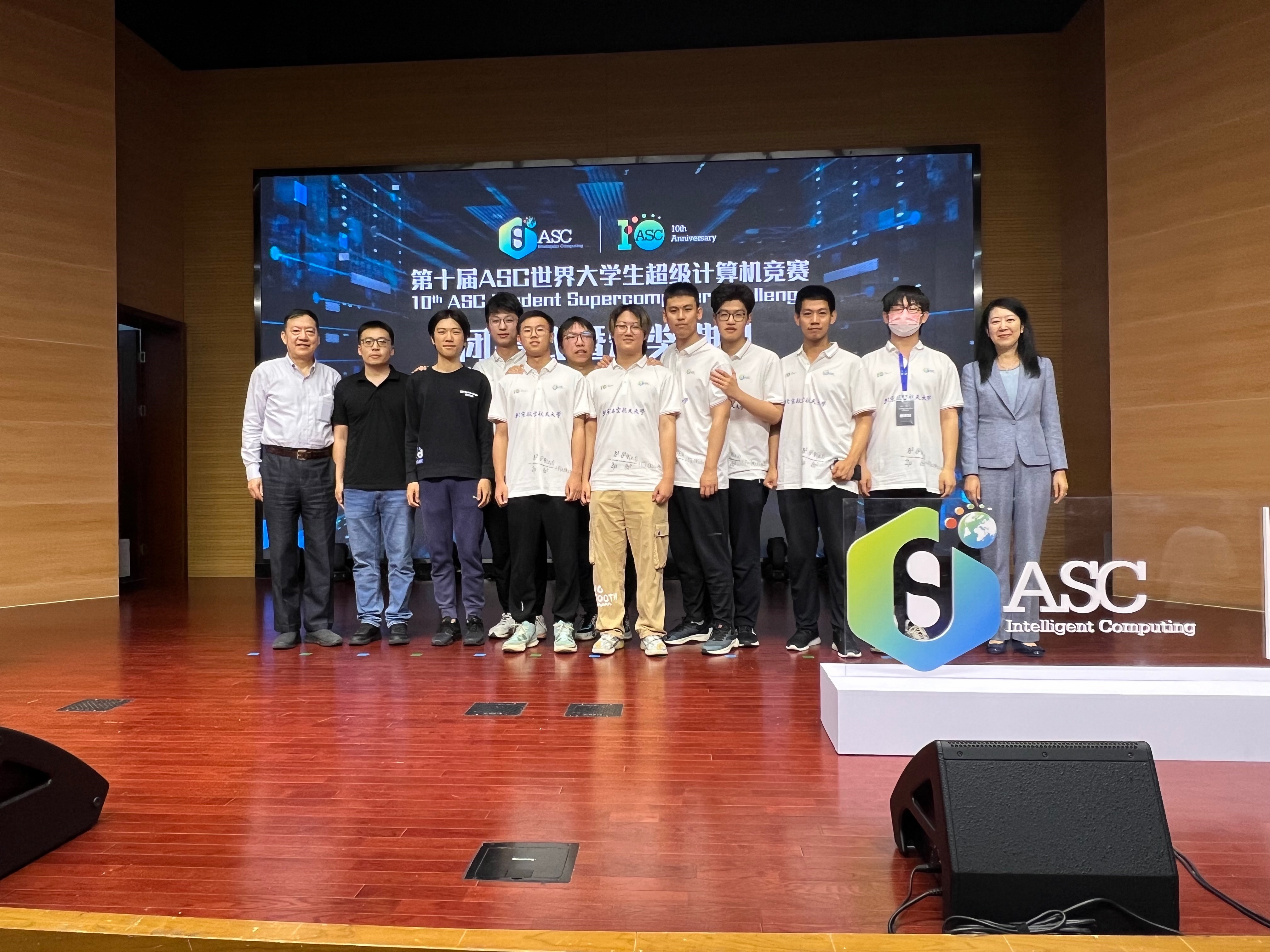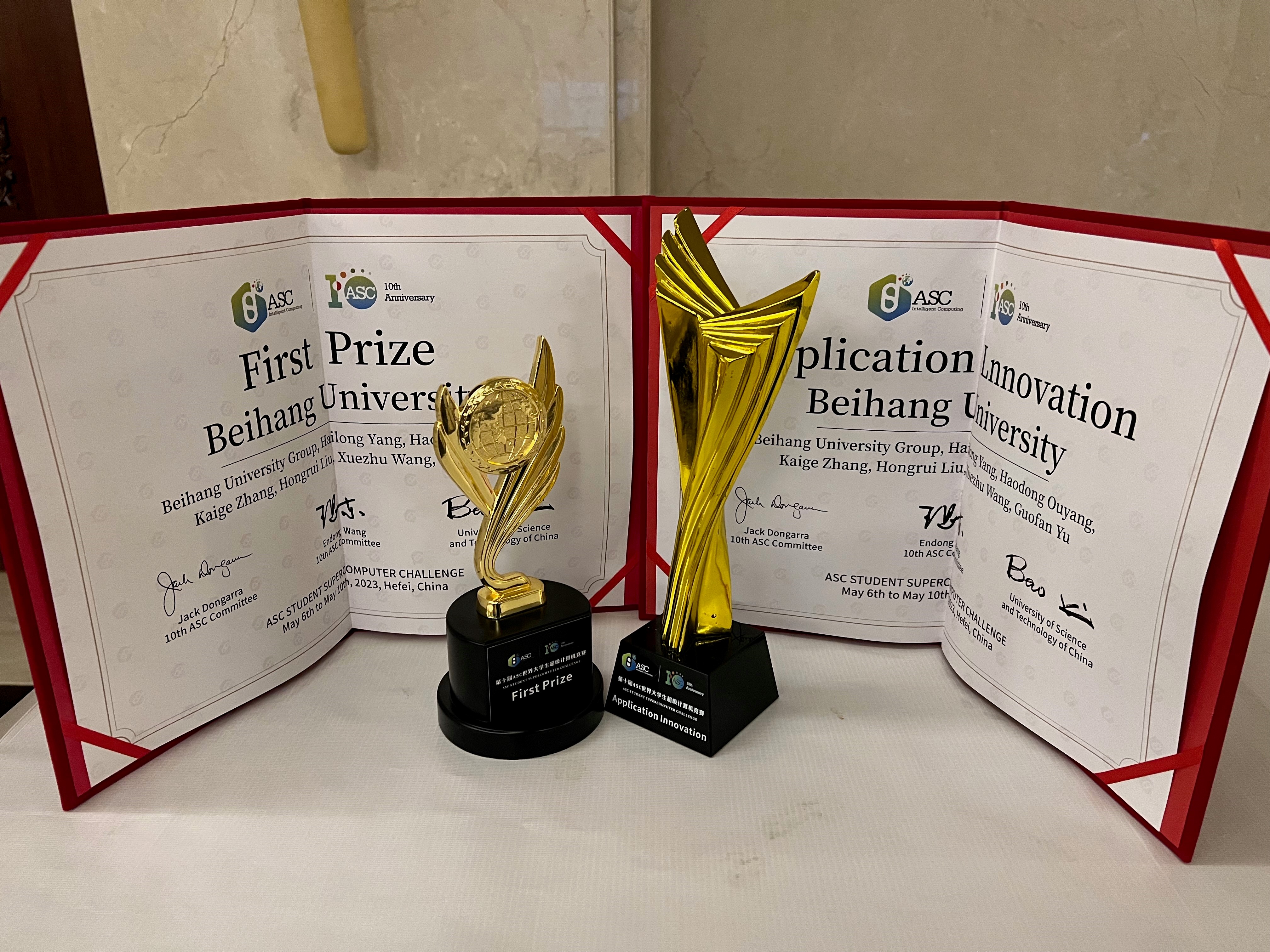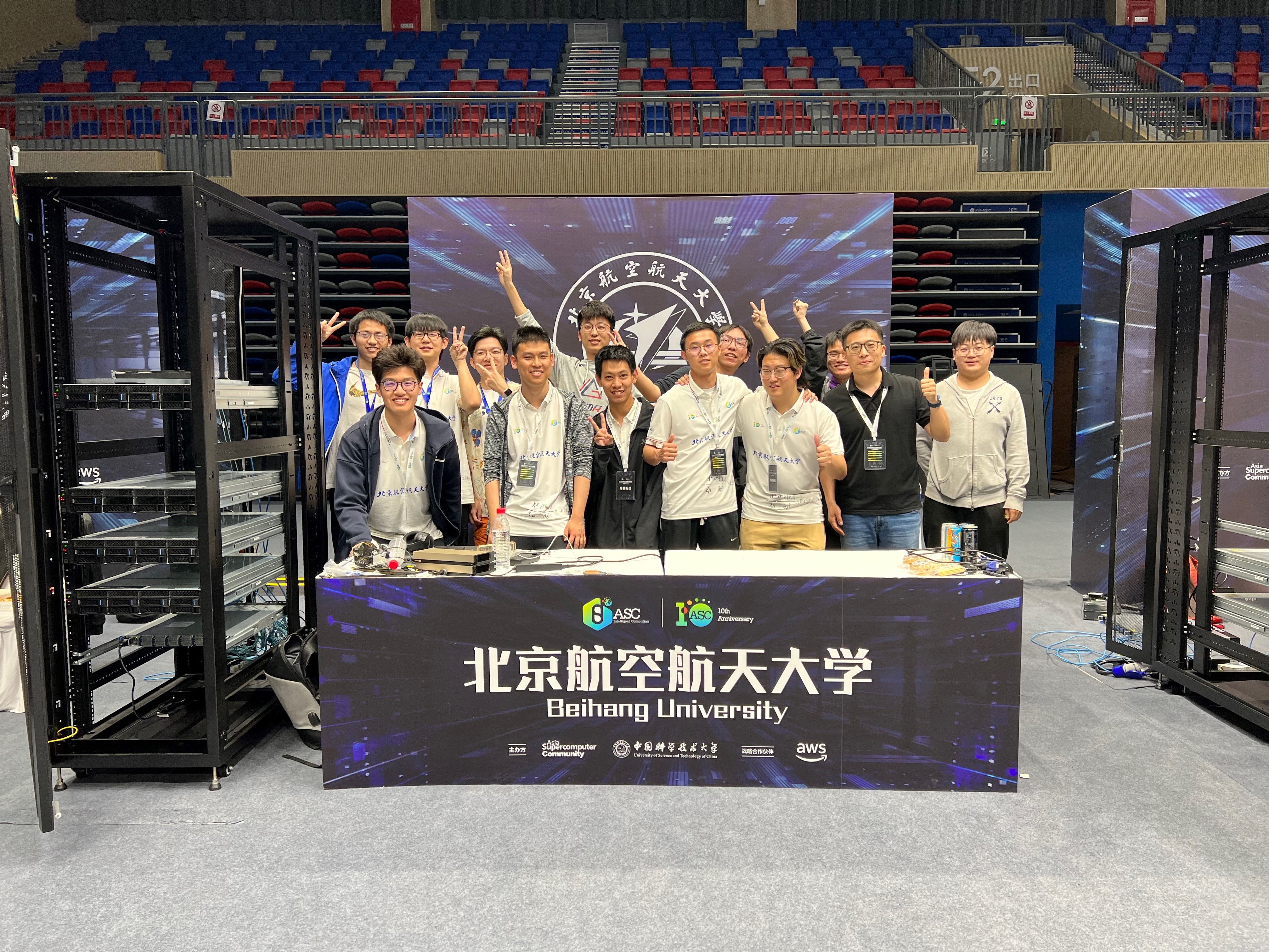5月10日全球规模最大的世界大学生超级计算机竞赛(ASC)总决赛在中国科学技术大学落下帷幕,在北航BV伟德官方网站杨海龙副教授的悉心指导下,由来自BV伟德官方网站的五名本科生参赛队员欧阳皓东(队长)、刘鸿睿、余国帆、张凯歌、王雪竹,以及五名观摩队员仲书璋、杜劭康、吴飞扬、孔昊然、安达楷组成的北航超算队在分子动力学模拟deepMD、海洋数值模拟FVCOM等多道赛题中取得了优异成绩。最终,北航超算队荣获第十届ASC全球总决赛一等奖和应用创新奖。这是北航超算队第九次获得ASC全球总决赛一等奖,彰显了北航本科生扎实的计算机系统结构知识和优秀的超算创新能力,也是BV伟德官方网站对“教赛研”相结合的新工科培养模式的成功探索。
